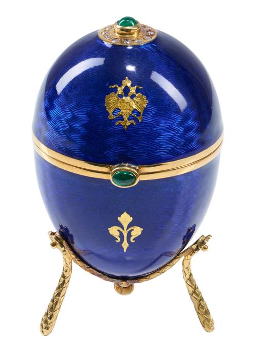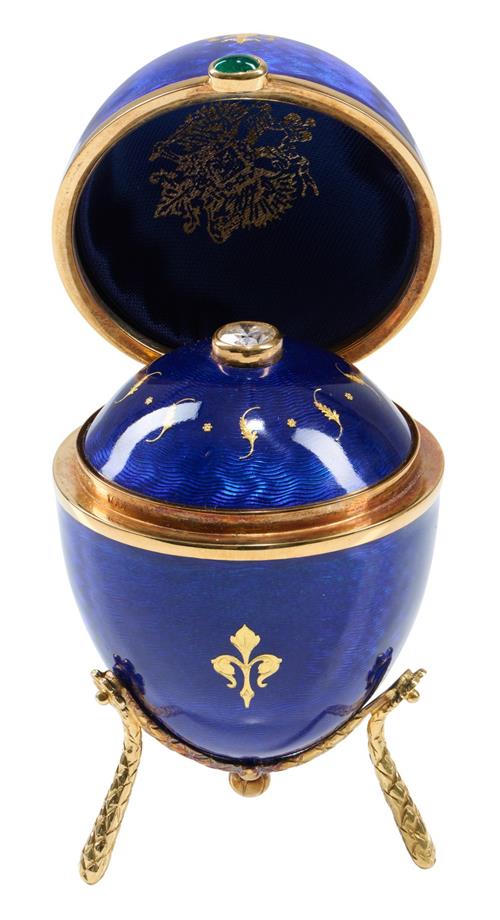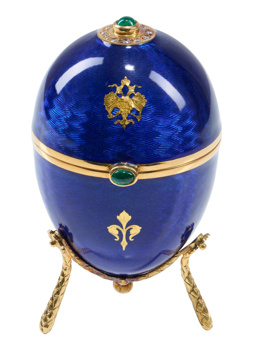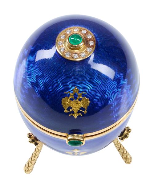 Of ovoid form applied with royal blue guilloché enamel supported on a gold base with three finely chased legs, the lid decorated with a cabochon emerald and diamond cluster finial and gold Russian Imperial Eagle and fleur-de-lys, with emerald push piece, the emeralds together weighing approximately 1.32 carats opening to reveal a brilliant-cut diamond weighing 1.12 carats within a circular gold collet, weight approximately 129 grams, height approximately 750mm, signed Fabergé, with workmaster's marks for Victor Mayer, numbered 1/25, accompanied by a Fabergé certificate, presentation box and outer packaging.
