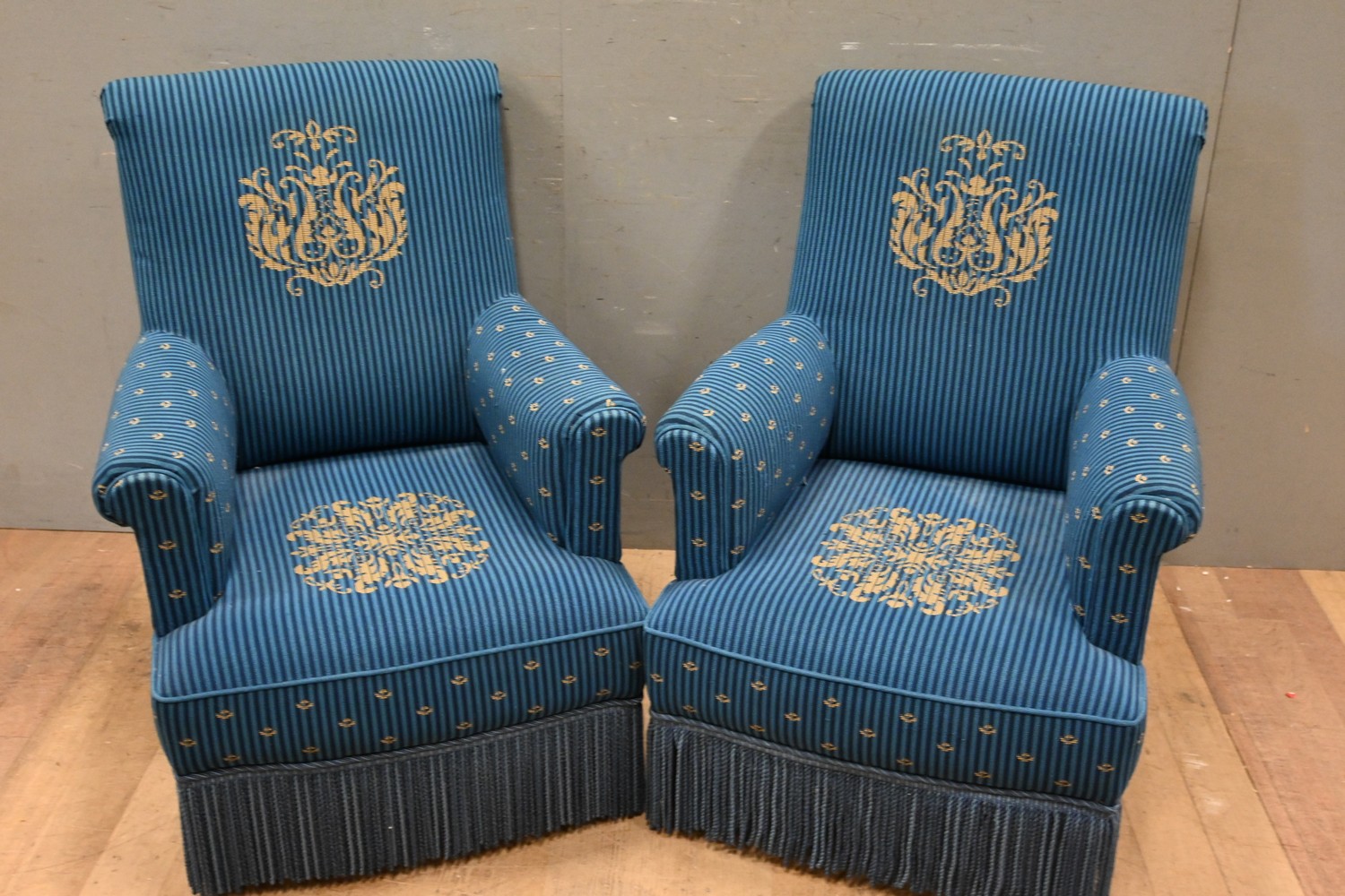 A PAIR OF BLUE BERGERES IN NAPOLEON III STYLE, EX HOTEL INTERCONTINENTAL, PARIS (A/F) (H96 X W73 X D85 CM) (PLEASE NOTE THIS HEAVY ITEM MUST BE REMOVED BY CARRIERS AT THE CUSTOMER'S EXPENSE. LEONARD JOEL STAFF CANNOT ASSIST CARRYING THIS ITEM) (X-LARGE ITEM)