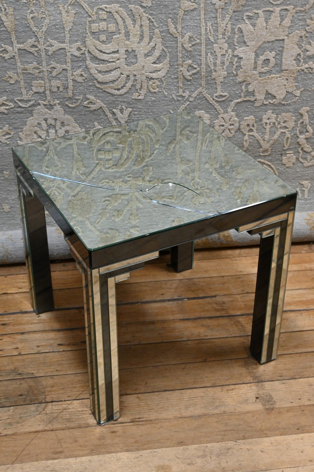 A SQUARE ART DECO MIRRORED SIDE TABLE - BROKEN MIRRORED TOP (A/F) (H61 X W61 X D61 CM) (LEONARD JOEL DELIVERY SIZE: LARGE)