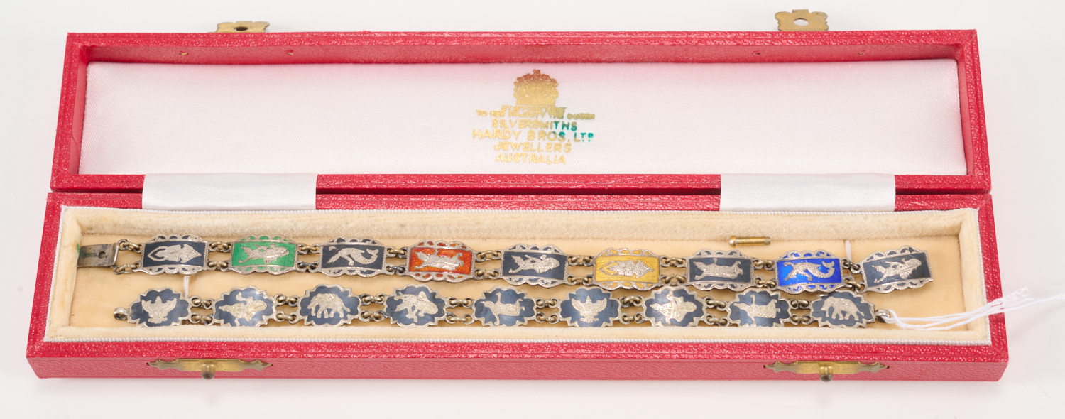 A PAIR OF FANCY LINK BRACELETS IN ENAMEL AND STERLING SILVER, FEATURING TRADITIONAL THAI DANCE DESIGN, LENGTH APPROXIMATELY 165MM AND 185MM
