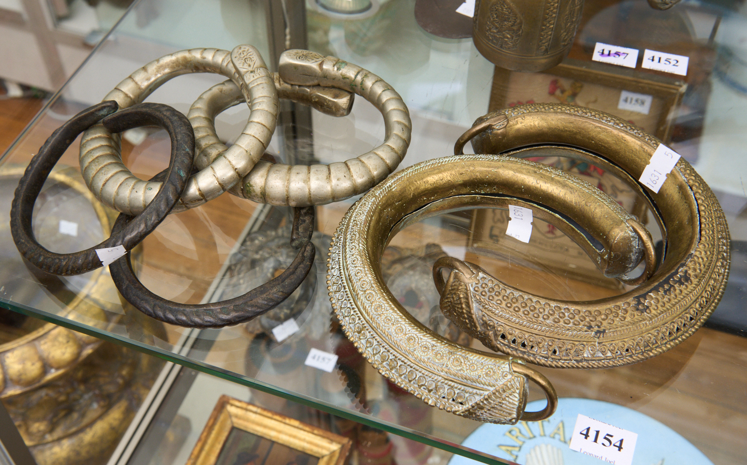 A GROUP OF BRASS AND IRON ITEMS INCLUDING CURRENCY BRACELETS, LEONARD JOEL LOCAL DELIVERY SIZE: SMALL