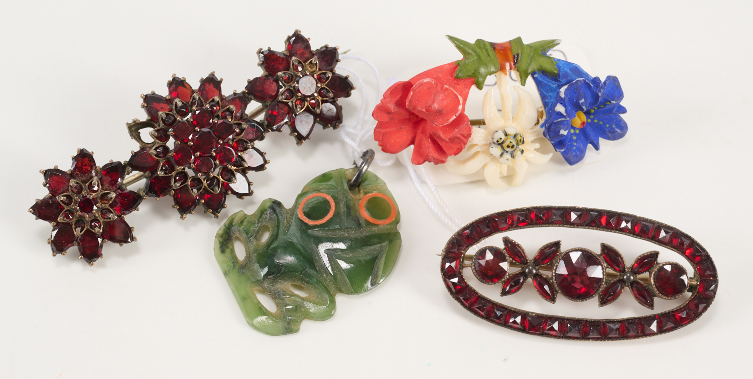 A COLLECTION OF VINTAGE BROOCHES, FEATURING PASTE SET AND CARVED JADE