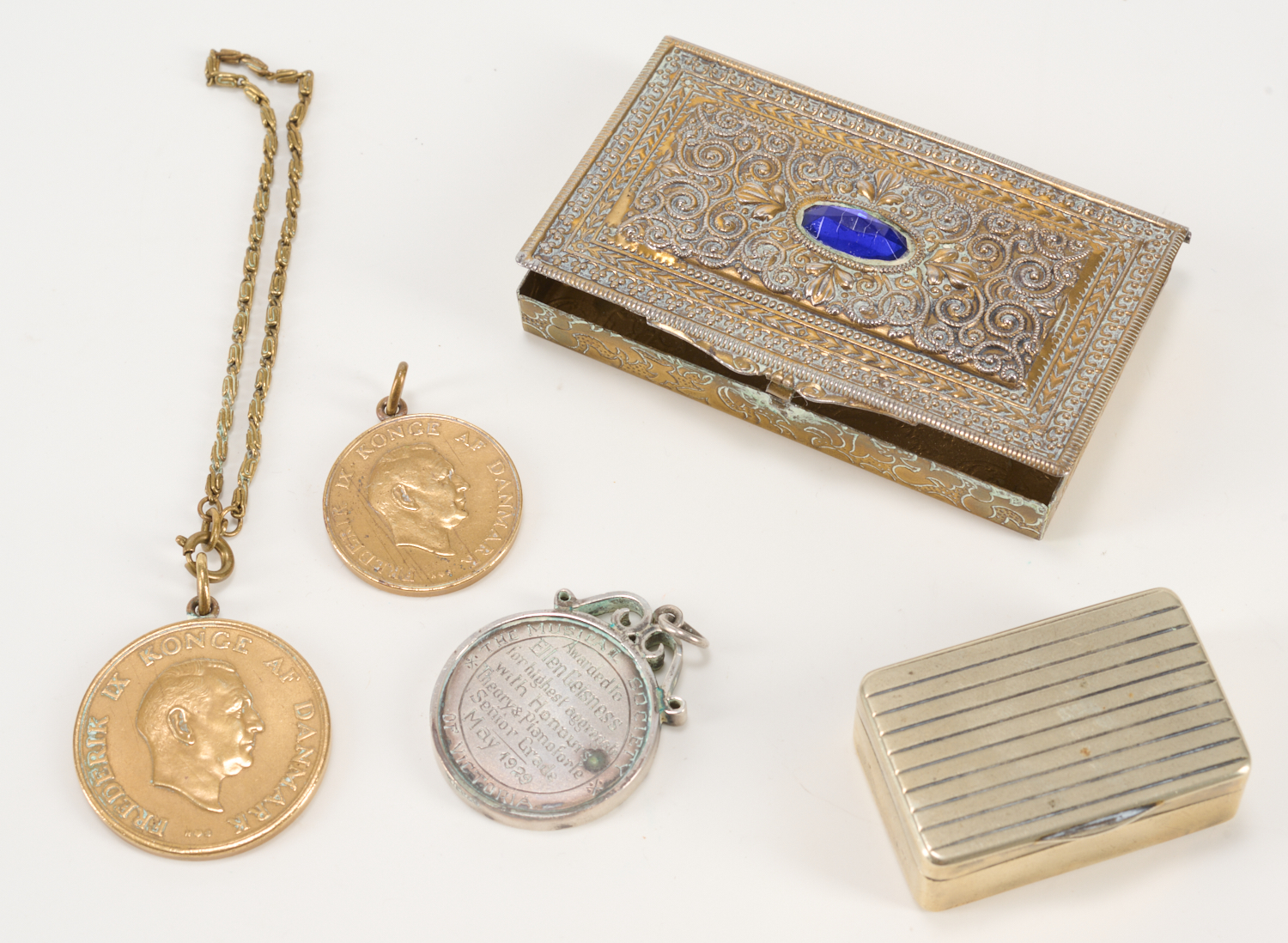 TWO PILL BOXES COMPRISING TWO KRONER COINS AND A MEDALLION IN SILVER