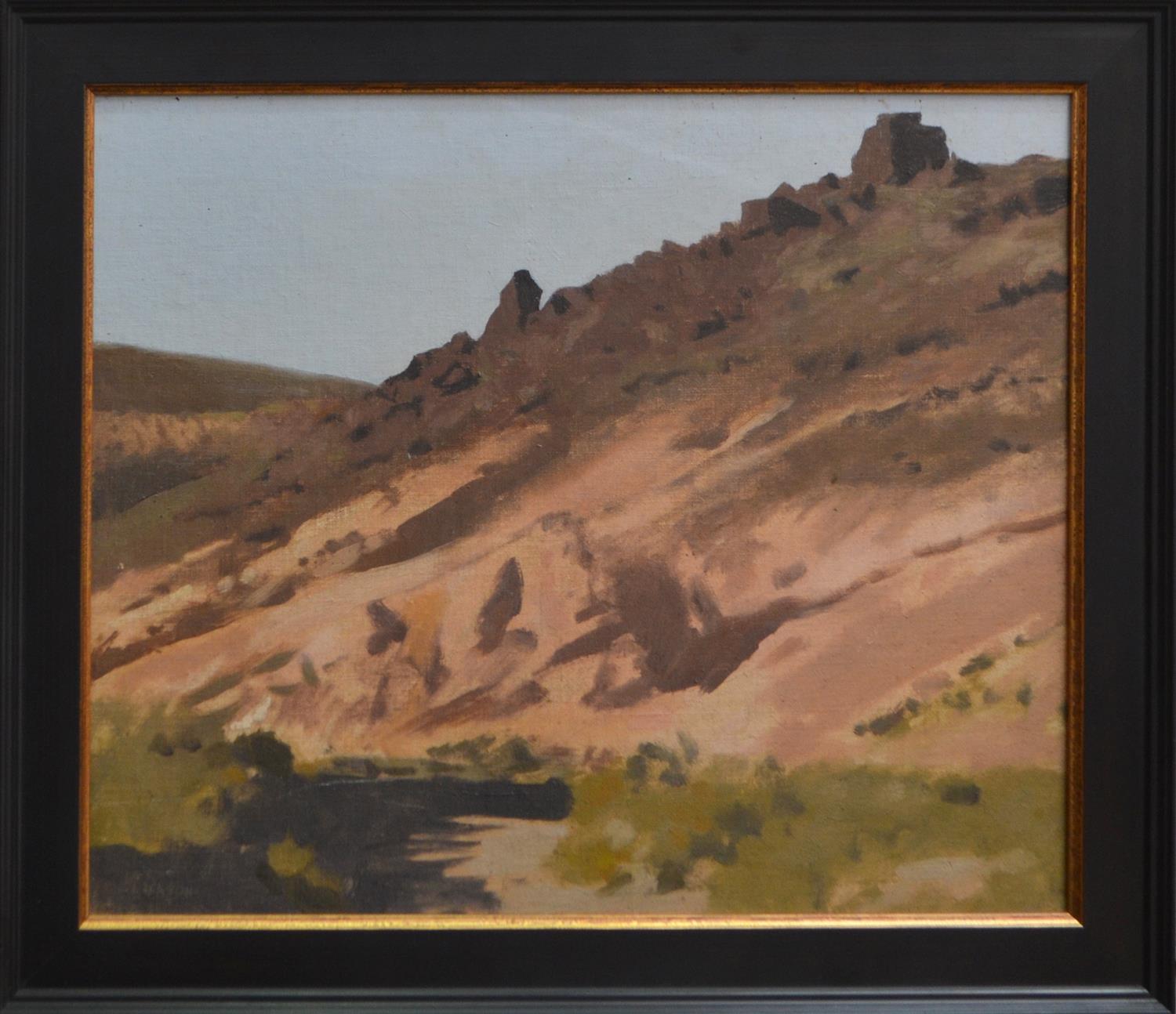 PERCY LEASON, CLIFFS, MOJAVE DESERT CALIFORNIA 1938, OIL ON CANVAS BOARD, 37 X 44CM