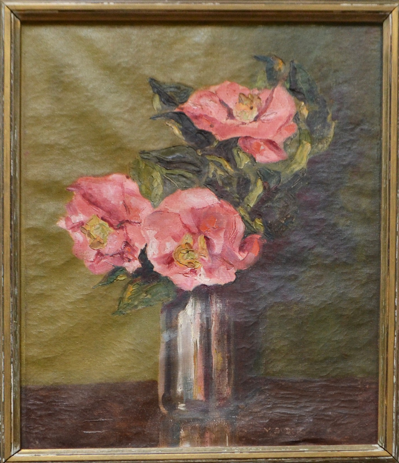V. SUDEK, FLOWER PIECE (CAMELIAS), OIL ON CANVAS PANEL, 45.5 X 35.5CM