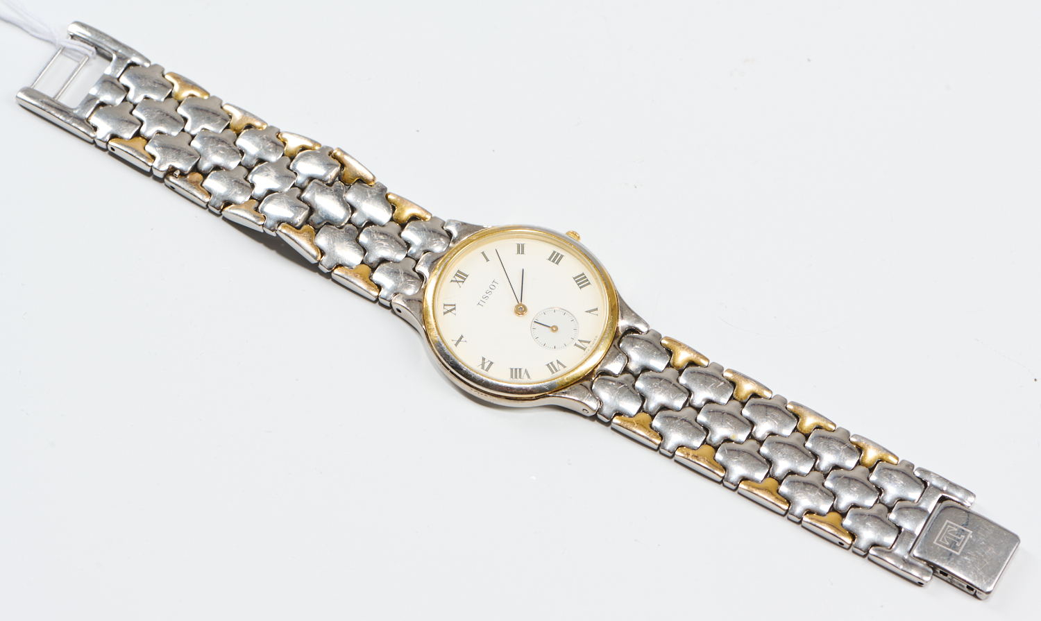 A TISSOT STAINLESS STEEL AND GOLD PLATED BRACELET WATCH, QUARTZ MOVEMENT, WITH TISSOT INTERNATIONAL GUARANTEE BOOKLET, DIAMETER APPROXIMATELY 31MM, LENGTH APPROXIMATELY 170MM