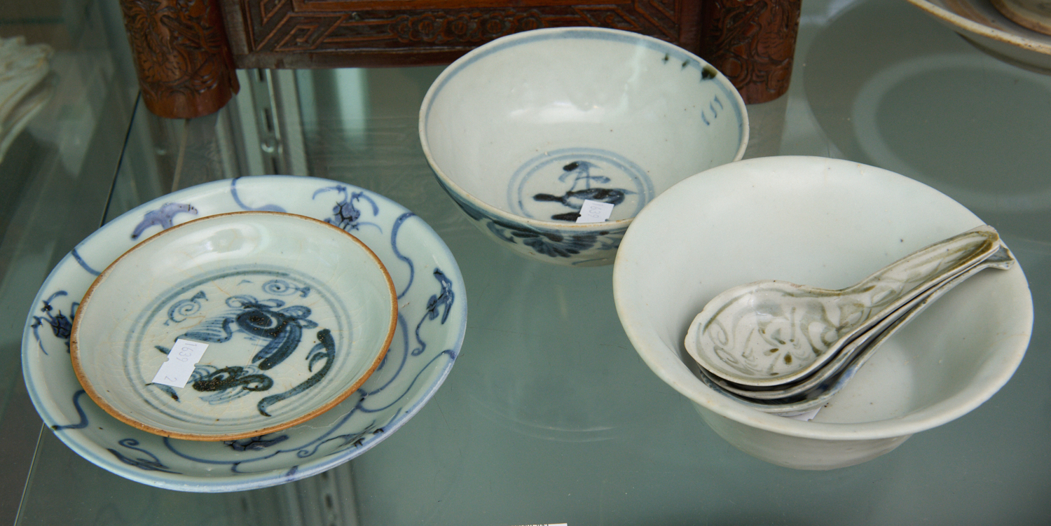 FOUR CHINESE DISHES AND THREE SPOONS, QING AND MING DYNASTY, LEONARD JOEL LOCAL DELIVERY SIZE: SMALL