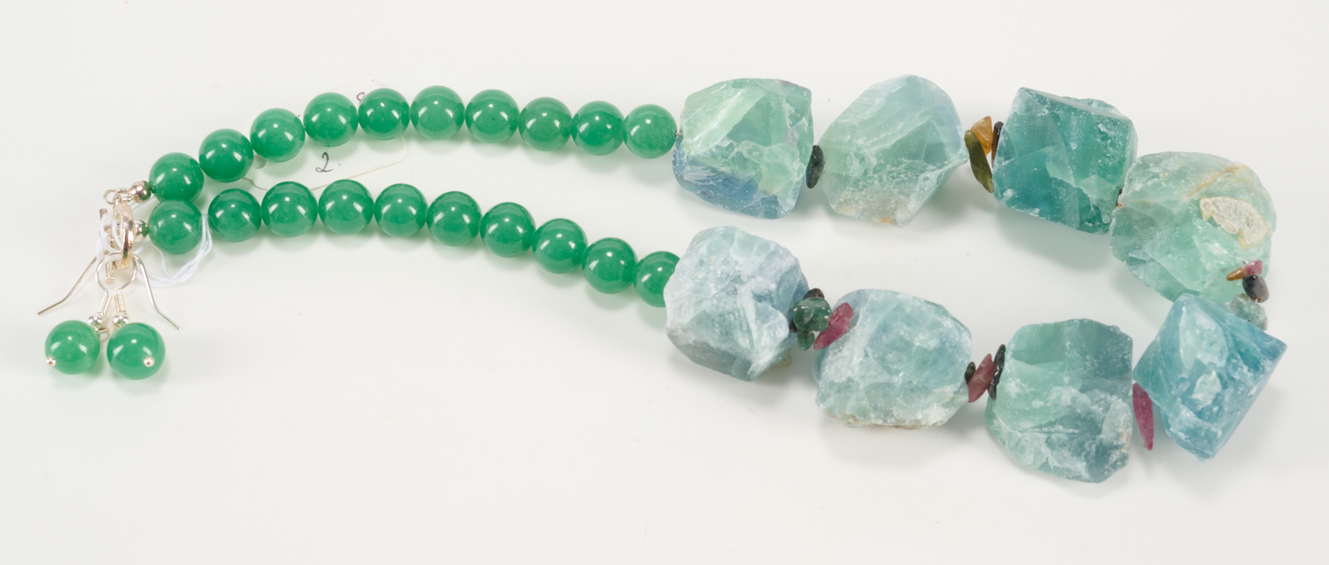 A FLUORITE AND GREEN AVENTURINE NECKLACE AND EARRING SET, TOTAL NECKLACE LENGTH 460MM