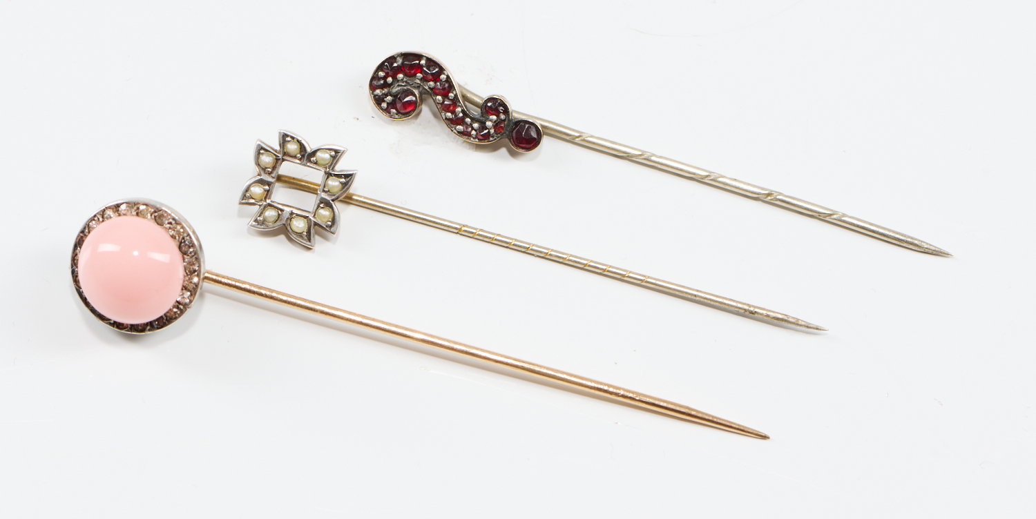 THREE STICKPINS FEATURING GARNET AND SEED PEARL DETAIL