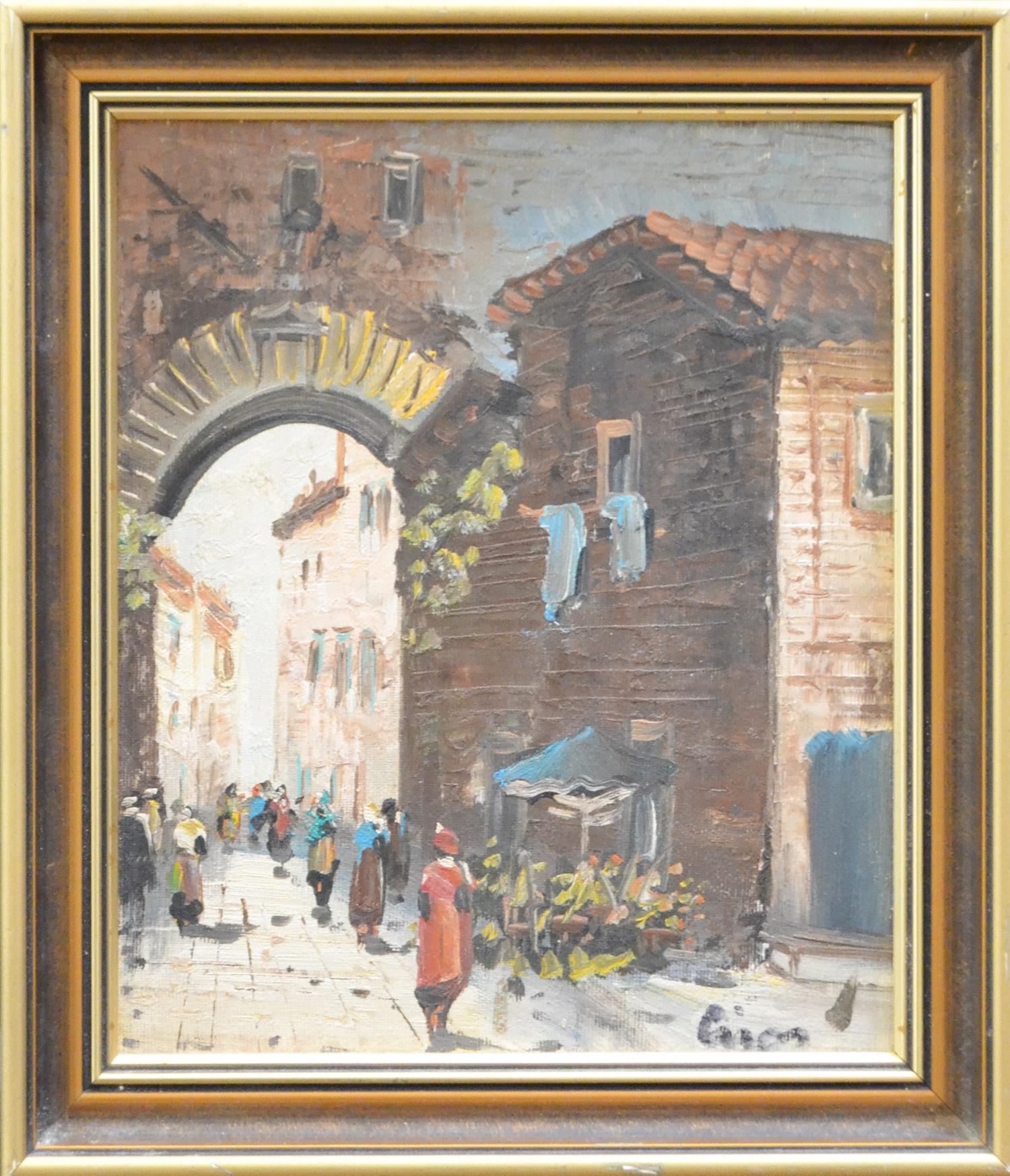 SIGNED GION, ITALIAN STREETSCAPE WITH FLOWER SELLER, OIL ON BOARD, 27 X 23CM