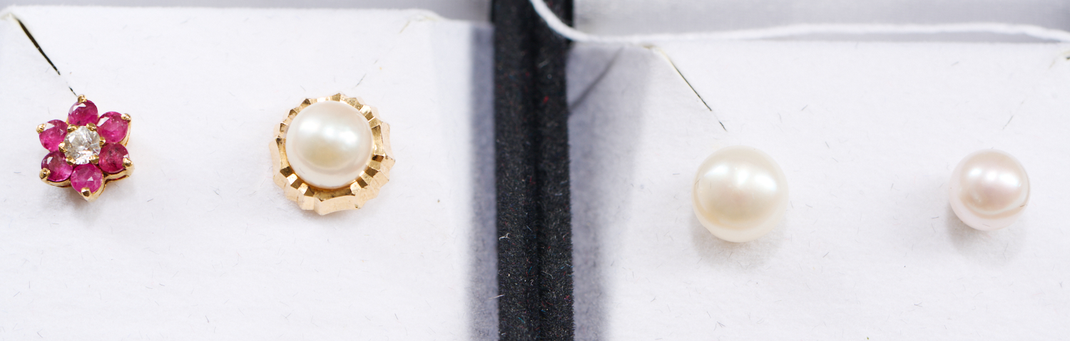 FOUR INDIVIDUAL STUDS IN 9CT GOLD, FEATURING PASTE AND CULTURED PEARLS, TO POST FITTINGS