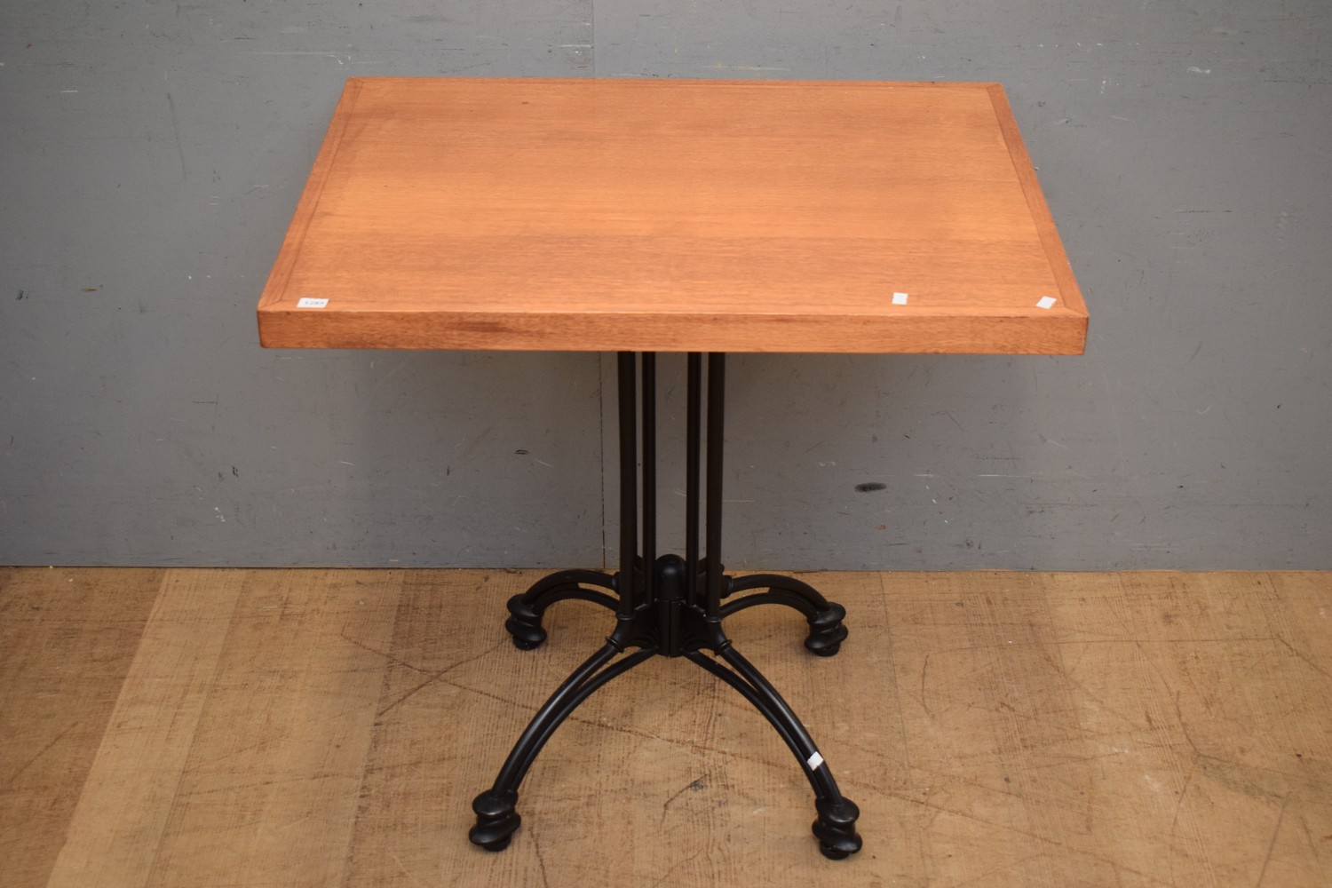A BLACK METAL BASED WOODEN TOP PATIO CAFÉ TABLE (73H x 75W x 60D CM) (LEONARD JOEL DELIVERY SIZE: LARGE)