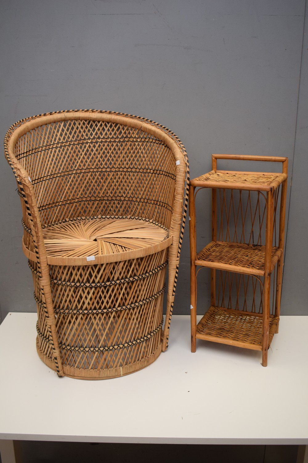 A RETRO CANE PEACOCK FORM ARMCHAIR AND THREE TEAR CANE WHATNOT ( 78H X 57 DIAMETER CM) (LEONARD JOEL DELIVERY SIZE: LARGE)