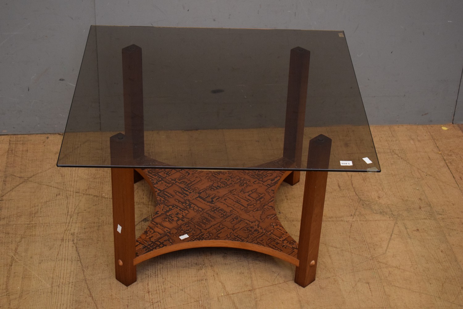 A WOODEN AND GLASS TOPPED COFFEE TABLE WITH ORIGINAL APPLIED COPPER DETAILING TO BASE (41H x 68W x 68D CM) (LEONARD JOEL DELIVERY SIZE: LARGE)