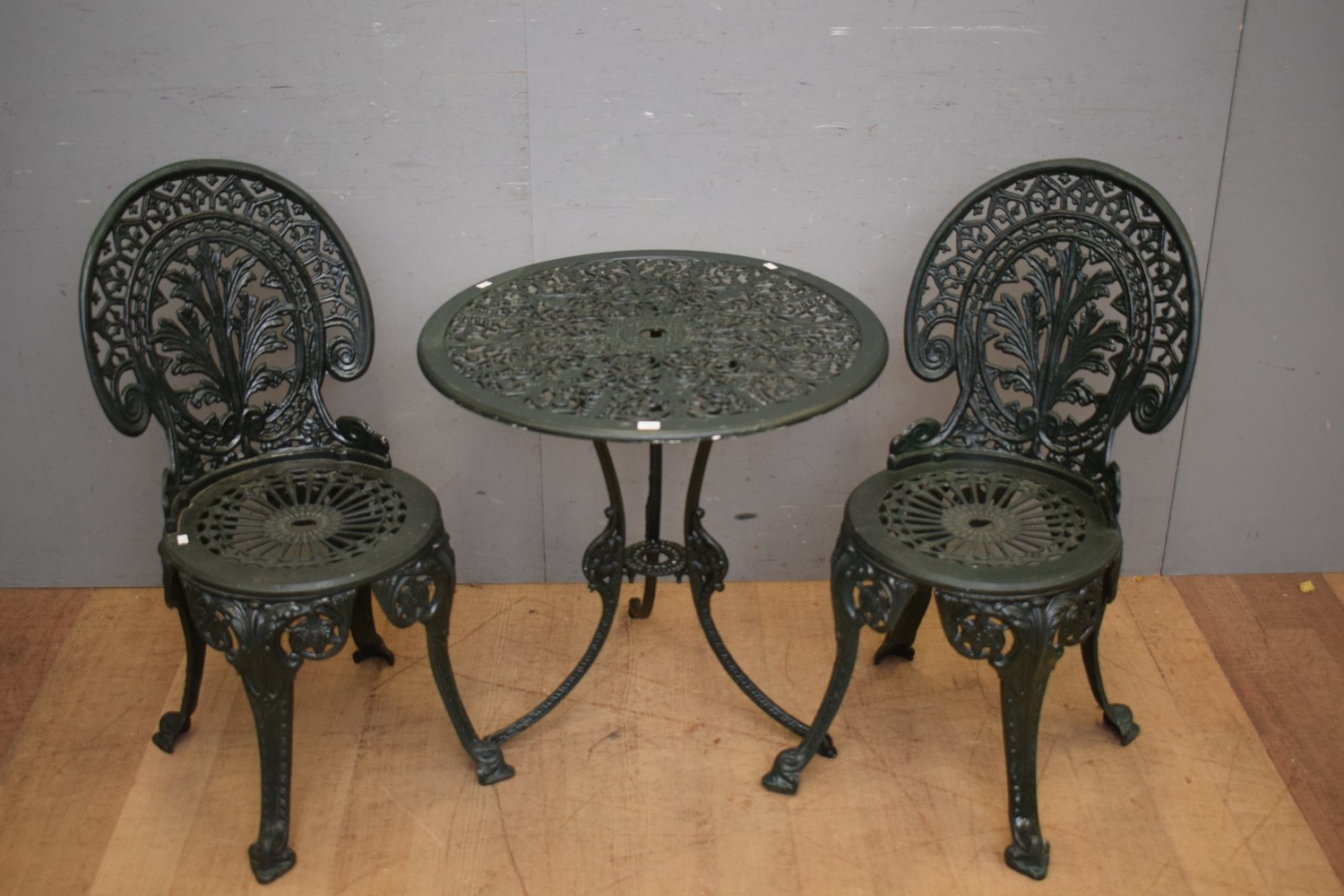 A CAST IRON AND ALLOY GREEN PAINTED THREE PIECE OUTDOOR SETTING (65H x 66D CM) (LEONARD JOEL DELIVERY SIZE: LARGE)