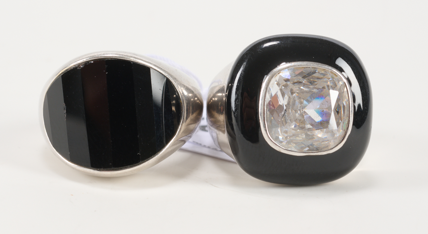 TWO ONYX AND CUBIC ZIRCONIA RINGS IN STERLING SILVER, RING SIZES P AND R