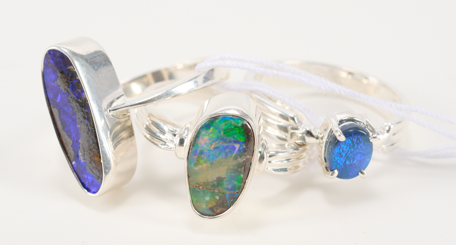 THREE OPAL SET RINGS IN STERLING SILVER, INCLUDING ONE DOUBLET AND TWO MATRIX, RING SIZES L, L/M AND O