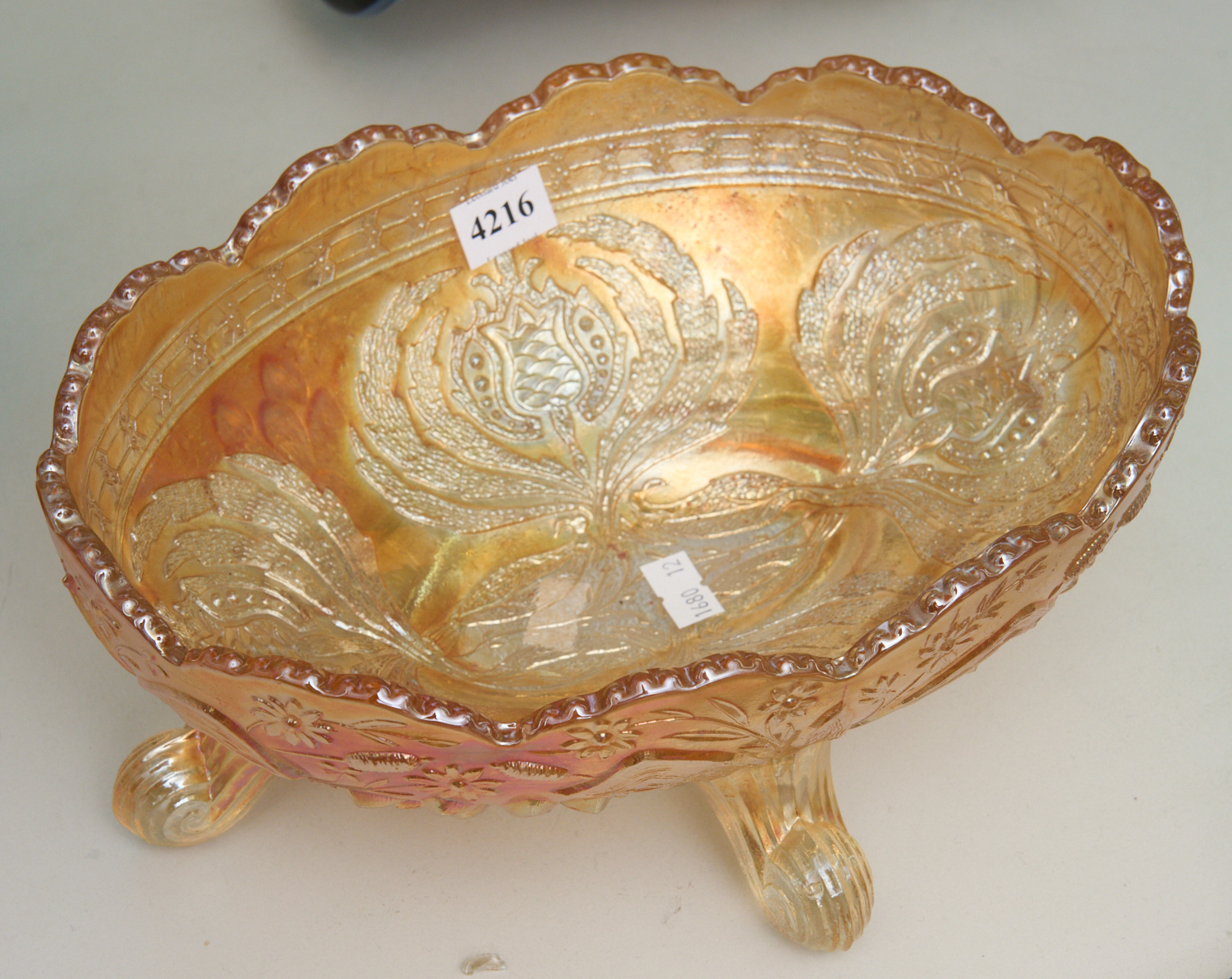 A CARNIVAL GLASS OVAL BOWL WITH AUSTRALIAN WARATAH MOTIF TO INSIDE AND OUTSIDE (26 CM W), LEONARD JOEL LOCAL DELIVERY SIZE: SMALL