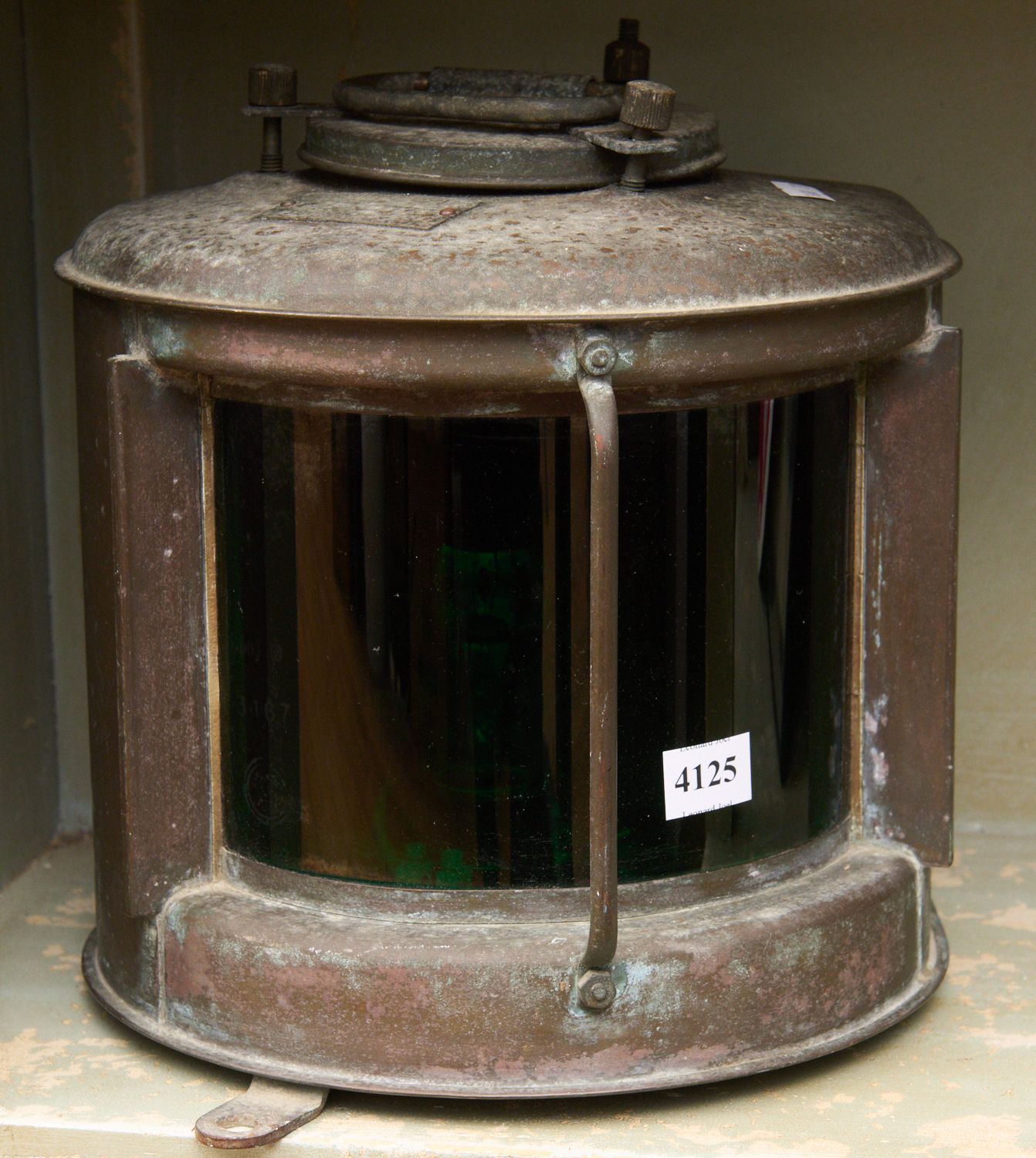 A COPPER AND BRASS SHIPS STARBOARD LANTERN WITH ORIGINAL CURVED GREEN GLASS PANEL (21 CM H), LEONARD JOEL LOCAL DELIVERY SIZE: SMALL