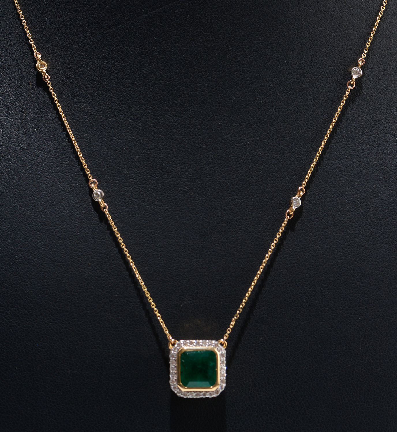 AN EMERALD AND DIAMOND PENDANT NECKLACE IN 18CT GOLD, THE EMERALD 3.14CT, THE DIAMONDS 0.34CTS, 4.98GRAMS