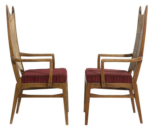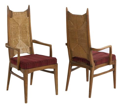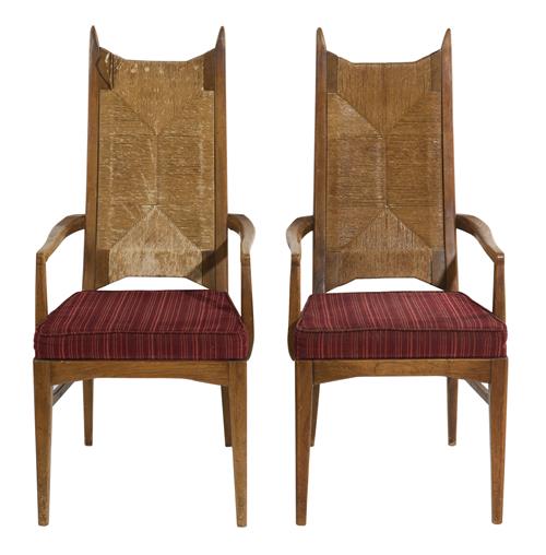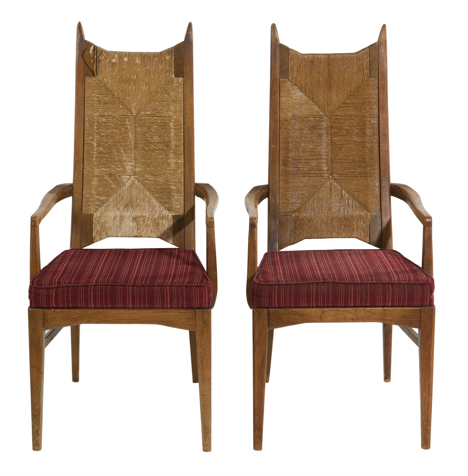 The rattan on each chair shows obvious signs of use for its age, minor cracking and damage to the arm of one of the chairs. The fabric is slighty faded consitent with age.