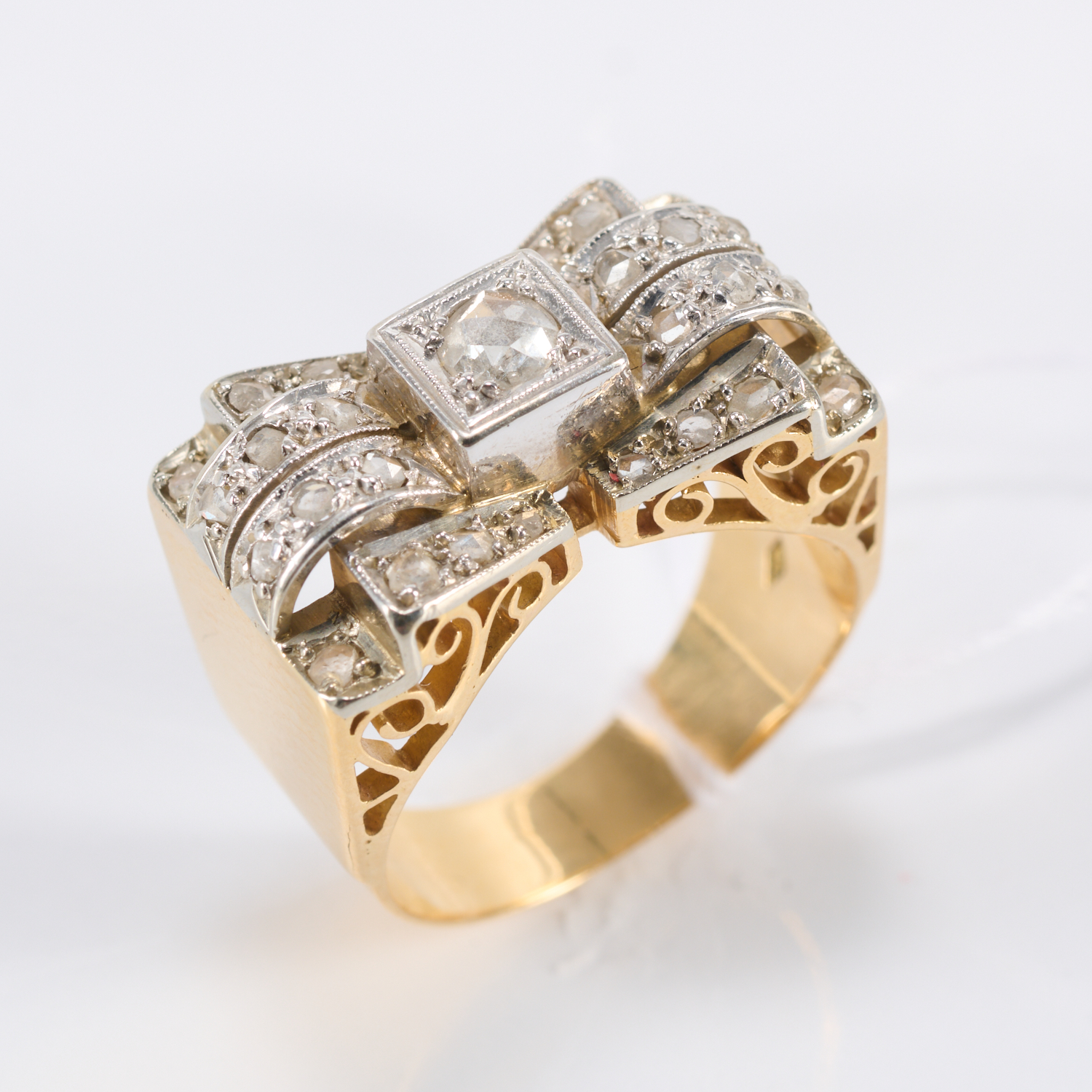A RETRO STYLE DIAMOND RING IN TWO TONE 18CT GOLD, RING SIZE L, 7.5GMS