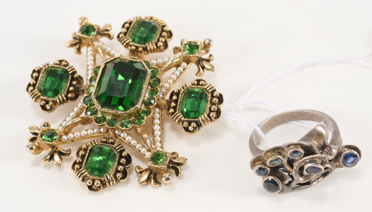 A HANDCRAFTED STERLING SILVER RING, TOGETHER WITH A VINTAGE BROOCH