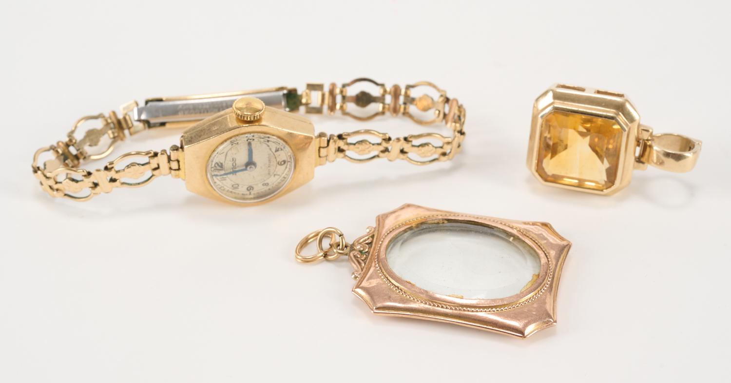 A COLLECTION OF GOLD FINDINGS INCLUDING A LADIES WATCH IN 9CT GOLD PLATE, CITRINE PENDANT IN 9CT AND PENDANT FRAME IN GOLD PLATE