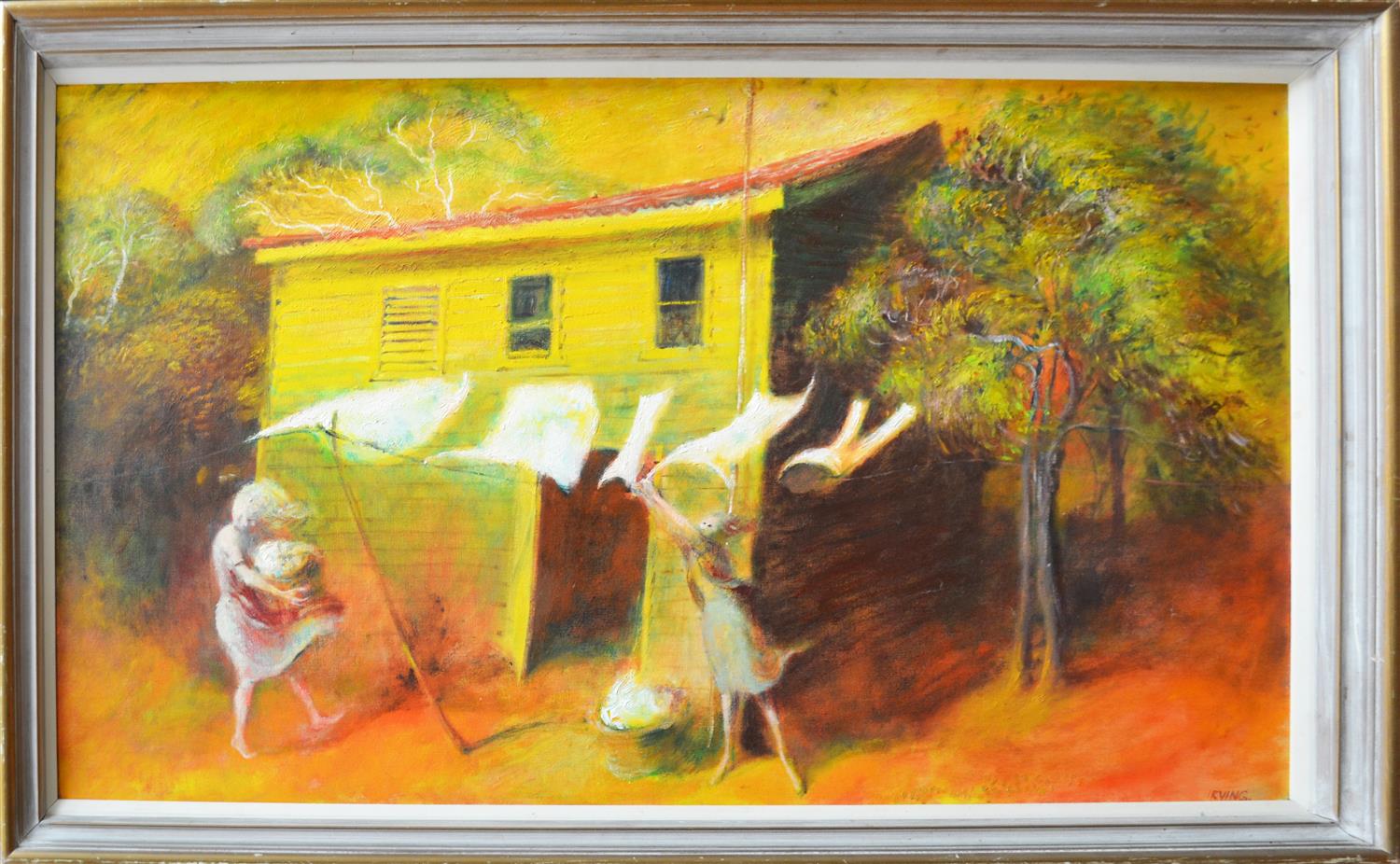 TONY IRVING, WASHING DAY 1965, OIL ON PREPARED BOARD, 61 X 104CM