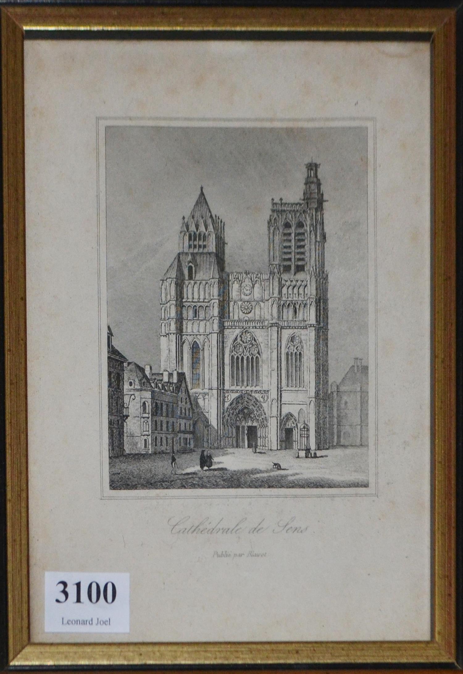 COLLECTION OF TWELVE FRENCH LITHOGRAPHS DEPICTING CHURCHES AND TWO ABSTRACT WOOD PANELS, 1860