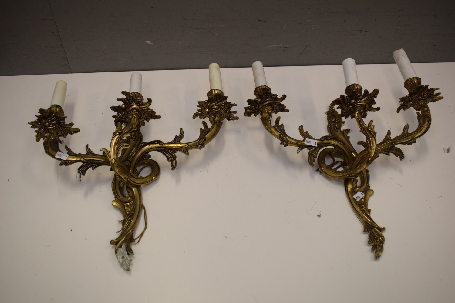 A PAIR OF DECORATIVE BRASS WALL SCONCES (45H x 37W CM) (LEONARD JOEL DELIVERY SIZE: MEDIUM)