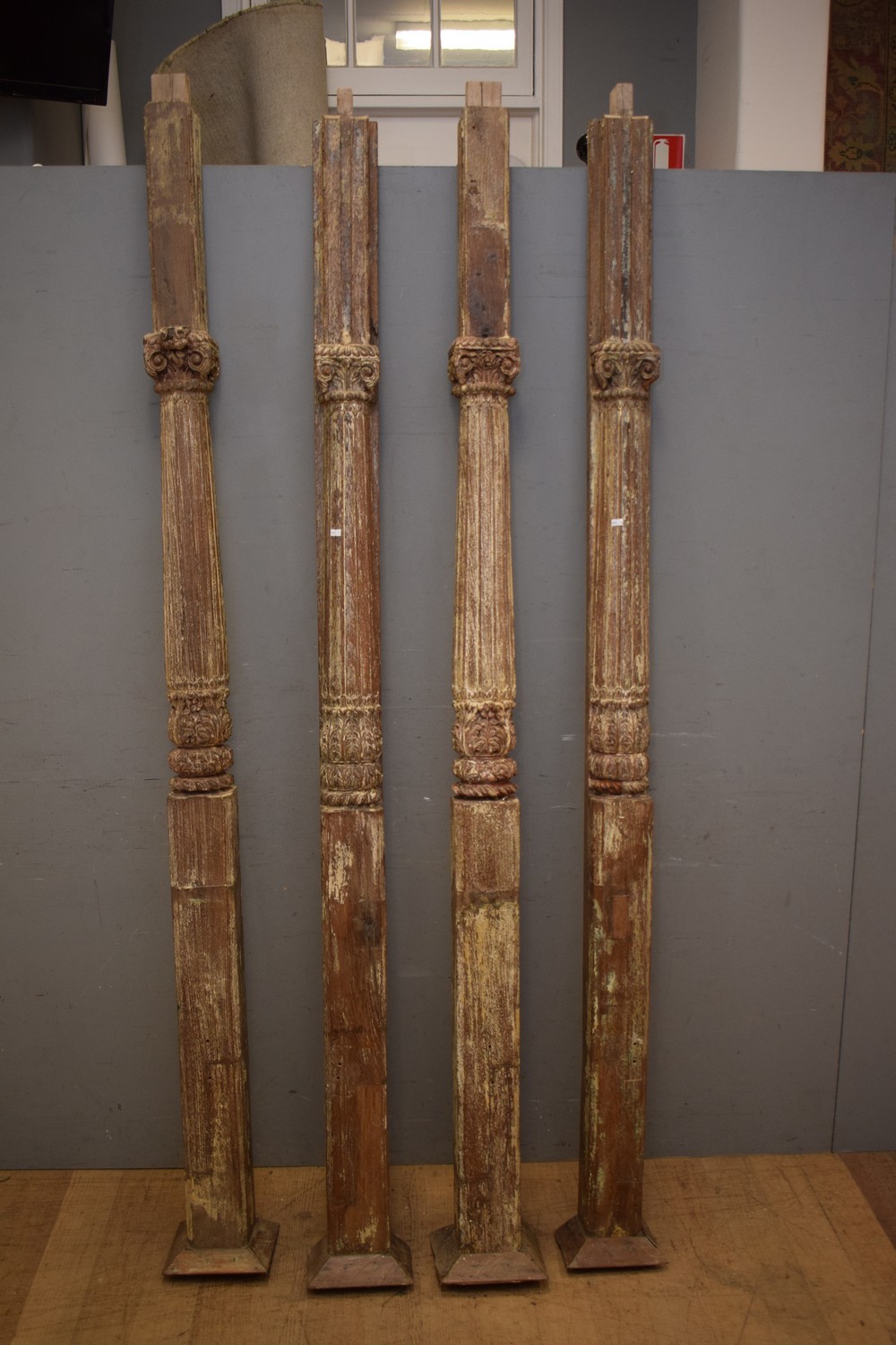A COLLECTION OF FOUR CARVED CORINTHIAN TIMBER PILLARS. CRAFTED FROM SOLID TEAK, INDIAN, EARLY 20th CENTURY. (221H CM) (LEONARD JOEL DELIVERY SIZE: X-LARGE)