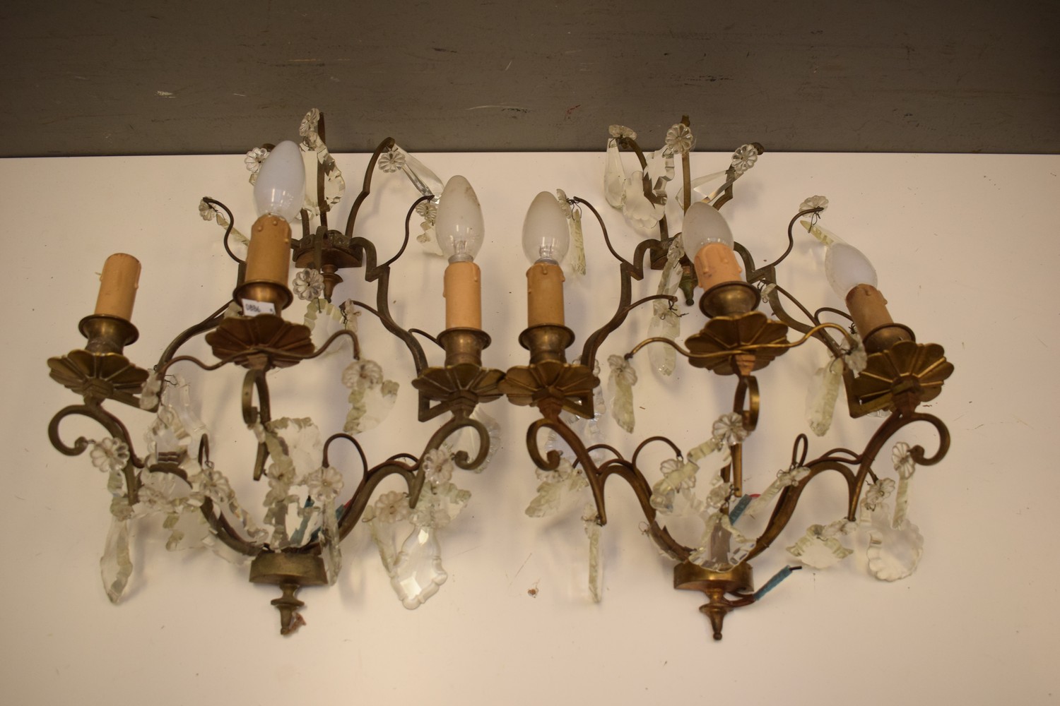 A PAIR OF FRENCH STYLE THREE BRANCH WALL SCONES (A/F) (38H x 31W CM) (LEONARD JOEL DELIVERY SIZE: MEDIUM)