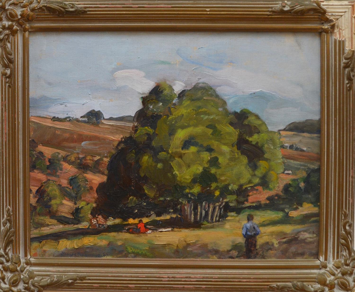 TEMPE MANNING, LANDSCAPE WITH FIGURES, OIL ON BOARD, 29 X 37CM