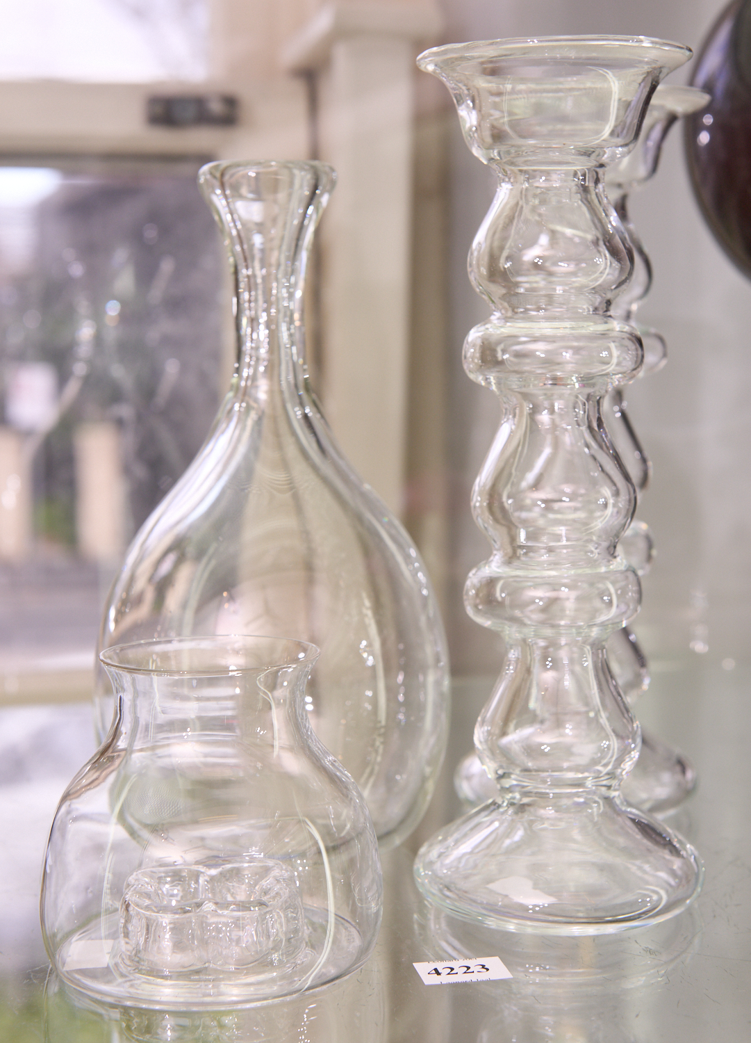 A COLLECTION OF DESIGNER GLASS INCLUDING SIGNED HANDBLOWN GLASS BOTTLE, LEONARD JOEL LOCAL DELIVERY SIZE: SMALL