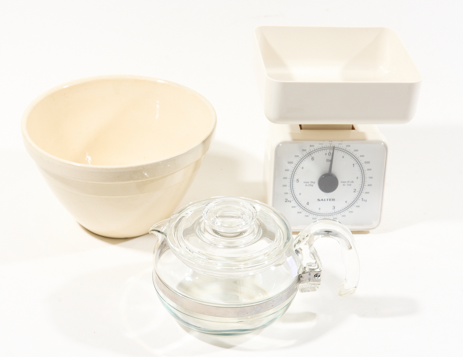 A VINTAGE HOFFMAN MIXING BOWL (SIZE 12, 13H X 22.5W CM), SALTER SCALES AND PYREX TEA POT, LEONARD JOEL LOCAL DELIVERY SIZE: SMALL