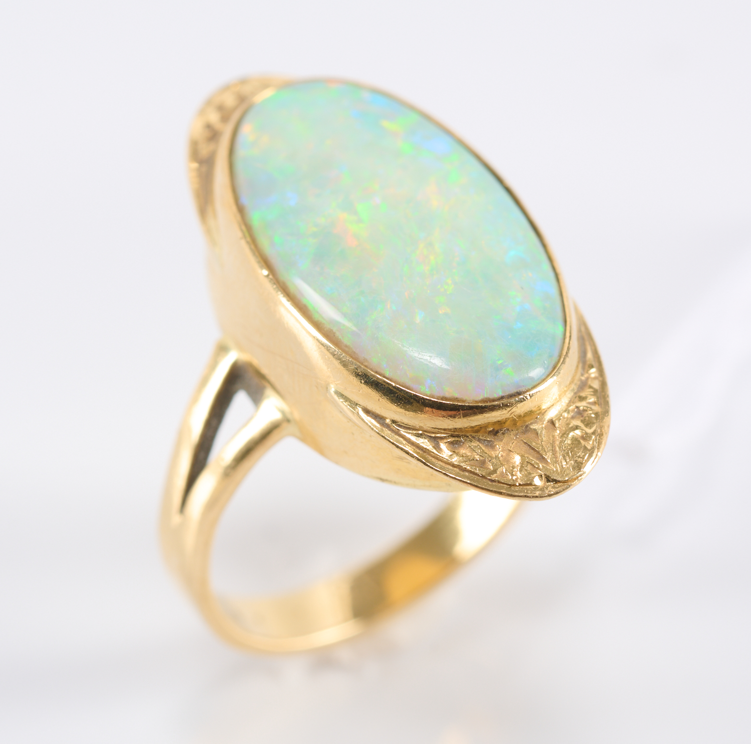 AN OPAL RING IN 18CT GOLD, RING SIZE M/N, 5.9GMS