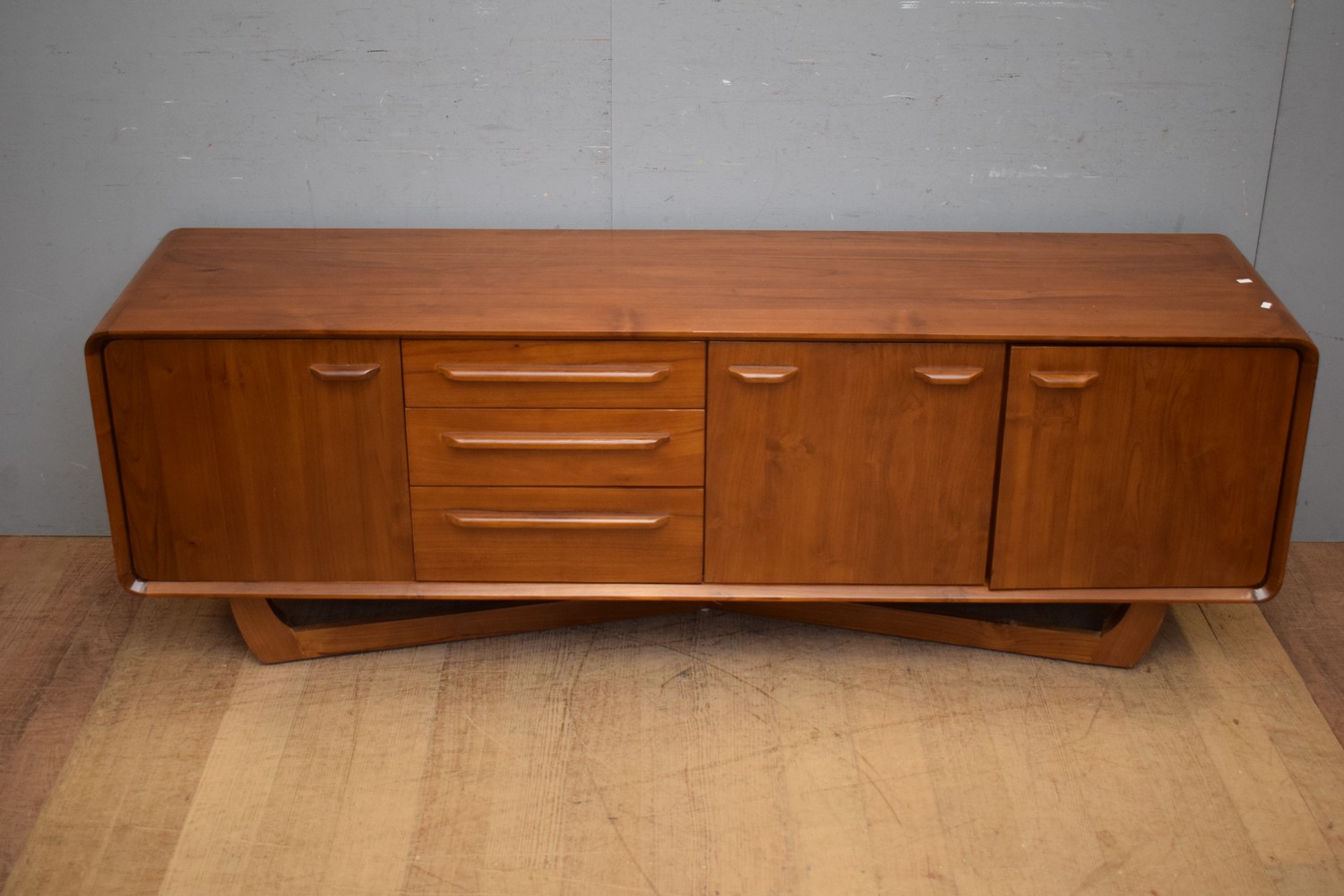 A MID CENTURY STYLE LOWRISE TEAK SIDEBOARD (61H x 181W x 45D CM) (PLEASE NOTE THIS HEAVY ITEM MUST BE REMOVED BY CARRIERS AT THE CUSTOMER'S EXPENSE. LEONARD JOEL STAFF CANNOT ASSIST CARRYING THIS ITEM) (X-LARGE ITEM)