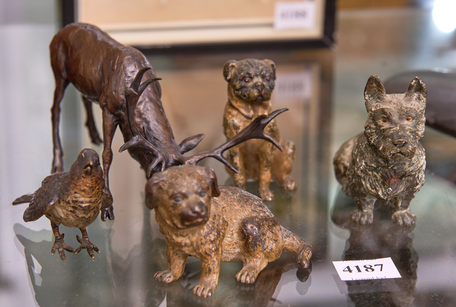 A GROUP OF THREE VIENNESE COLD PAINTED BRONZE DOGS TOGETHER WITH DEER AND BIRD, LEONARD JOEL LOCAL DELIVERY SIZE: SMALL