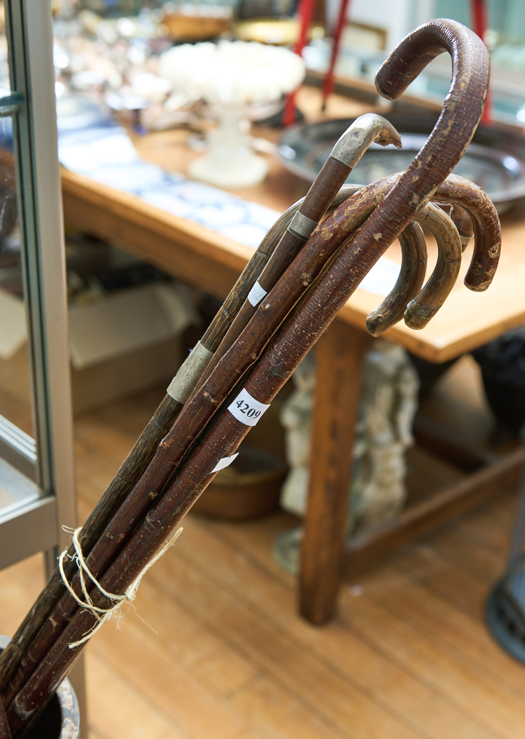 A GROUP OF SIX WALKING CANES SOME WITH STIRLING SILVER COLLARS, LEONARD JOEL LOCAL DELIVERY SIZE: SMALL