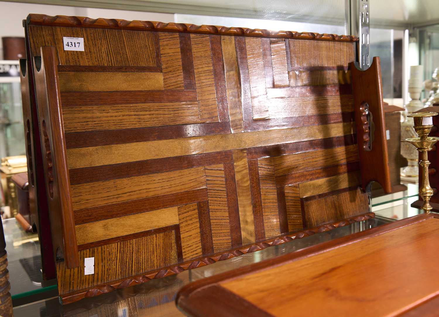 A TWO HANDLED TRAY INLAID WITH AUSTRALIAN TIMBERS, LEONARD JOEL LOCAL DELIVERY SIZE: SMALL