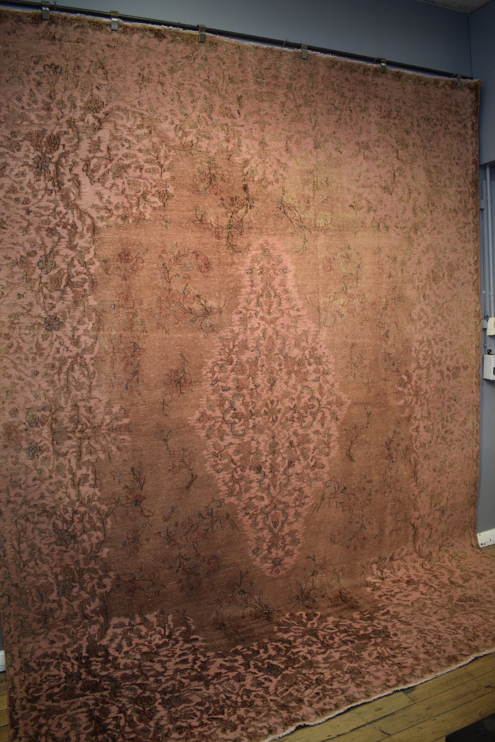 A MAGNIFICENT CONTEMPORARY VINTAGE PERSIAN KERMAN CARPET, VINTAGE PILE. A UNIQUE & INDIVIDUAL MODERN CARPET CREATED FROM AN AUTHENTIC FINELY HAND-KNOTTED VINTAGE PERSIAN KERMAN CARPET WITH CLASSIC DESIGN OF ELONGATED MEDALLION WITHIN AN OPEN FIELD OF FLORAL SPRAYS. THE PILE IS SHORN IN TONES OF ROSE AND CHAMPAGNE. CERTIFICATE OF AUTHENTICITY INCLUDED. SIZE: 409X307CM ORIGIN: PERSIA - RRP: $8,500