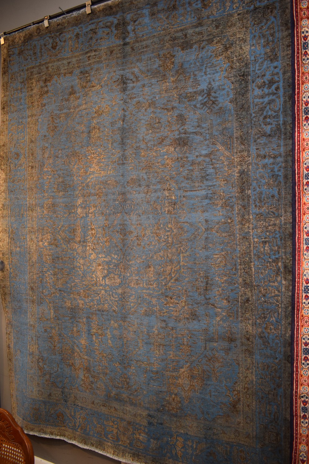 A CONTEMPORARY VINTAGE OVER-DYED PERSIAN TABRIZ CARPET, VINTAGE PILE. A UNIQUE & INDIVIDUAL MODERN CARPET CREATED FROM AN AUTHENTIC HAND-KNOTTED ALL-OVER DESIGN PERSIAN TABRIZ CARPET. THE PILE IS SHORN AND THE ENTIRE IS OVER-DYED IN CERULEAN BLUE, GOLD AND BROWN.  CERTIFICATE OF AUTHENTICITY INCLUDED. SIZE: 283X203CM ORIGIN: PERSIA - RRP: $4,400