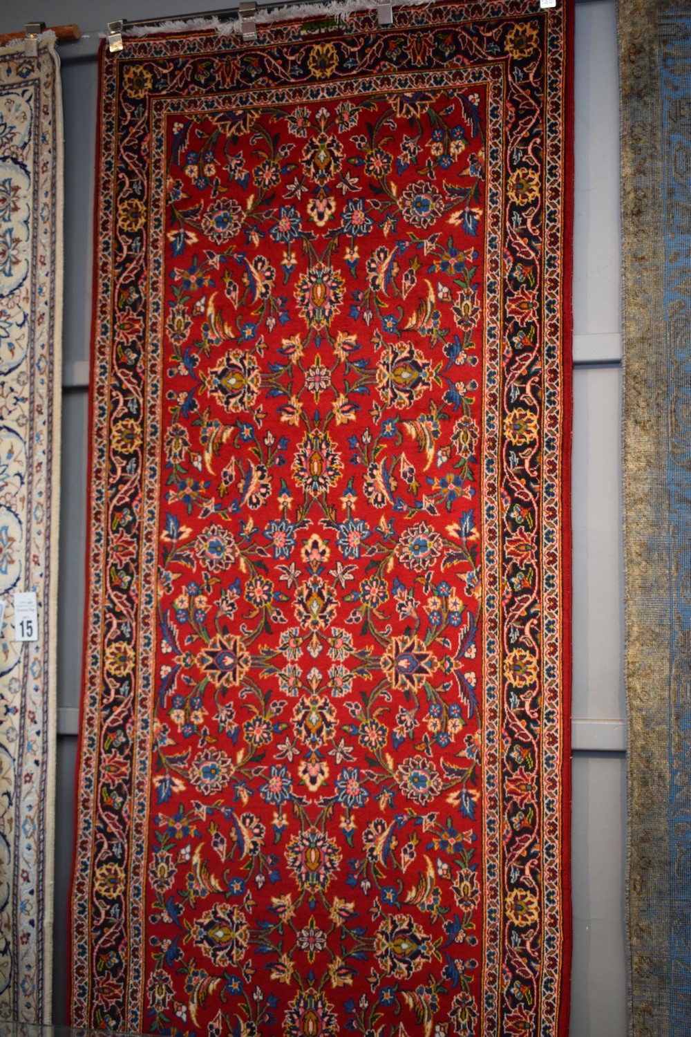 A FINE PERSIAN KASHAN HALLRUNNER. 100% WOOL DENSE PILE. STURDY & HARD-WEARING. RARE ALL OVER DESIGN OF SHAH ABBASSI PALMETTES, FLORAL SPRAYS & TENDRILS ON A DEEP RICH RED FIELD. BORDER OF PALMETTES AND TENDRILS. SIGNED PIECE. CERTIFICATE OF AUTHENTICITY INCLUDED. SIZE: 405X114CM ORIGIN: KASHAN/PERSIA - RRP: $5,800