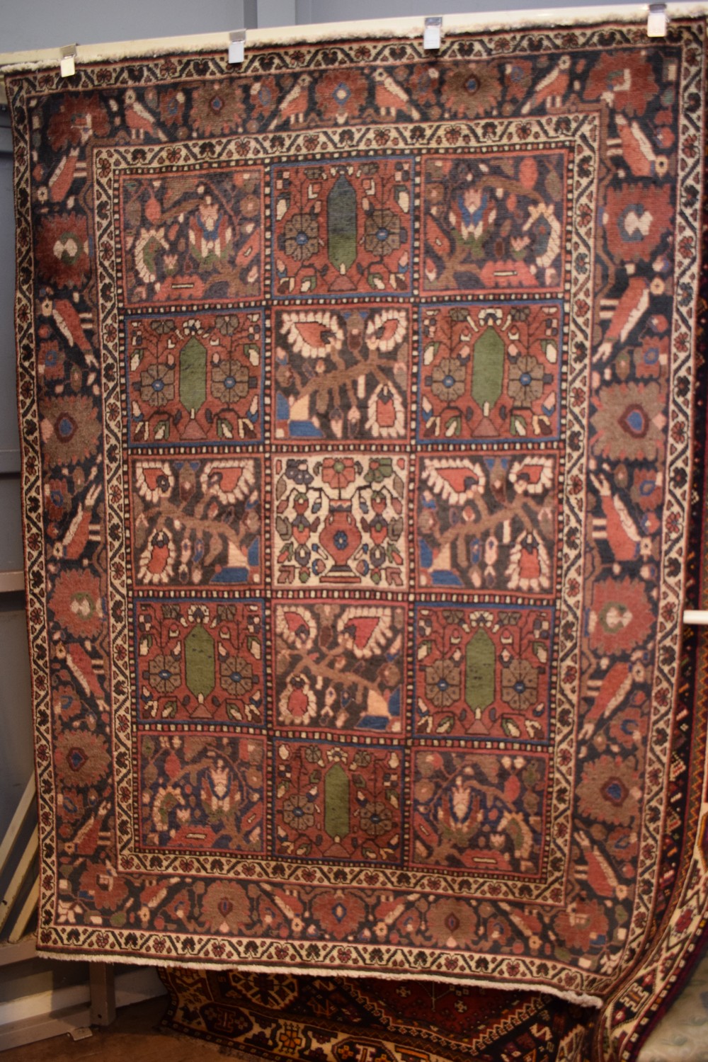 HAND-KNOTTED TRIBAL BAKHTIARI WEAVE WITH TRADITIONAL "GARDEN" DESIGN WITH PANELS CONTAINING GARDEN THEMES OF WILLOW TREES, FLORAL SHRUBS, PALMETTES AND PRAYER NICHES. BORDER OF TRIBAL MOTIFS. SIZE: 212X150CM ORIGIN: PERSIA - RRP: $1,900 CERTIFICATE OF AUTHENTICITY INCLUDED.