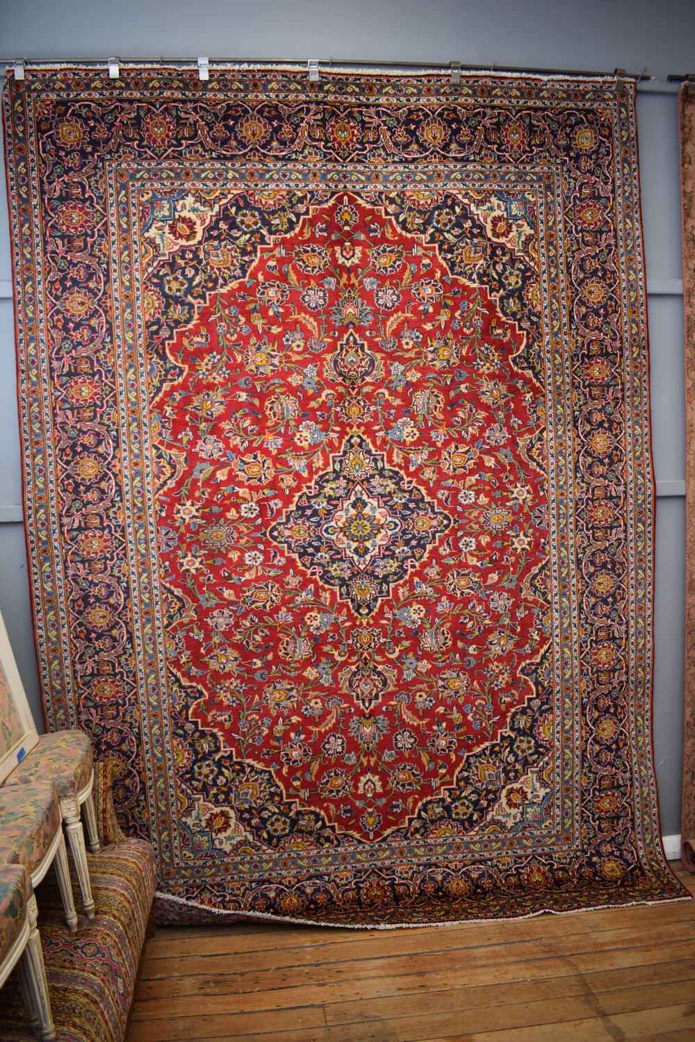 A FINELY HAND-KNOTTED PERSIAN KASHAN CARPET, 100% WOOL DENSE PILE, FINE WEAVE. CLASSIC KASHAN BOOK-COVER DESIGN OF ELONGATED FLORAL MEDALLION & CORNER MEDALLIONS IN A RED FIELD OF SHAH ABBASSI PALMETTES, FLORAL SPRAYS & TENDRILS. BORDER OF PALMETTES AND TENDRILS IN ROYAL BLUE. STURDY & HARD-WEARING. EX-GALLERY INVENTORY. IN EXCELLENT CONDITION. CERTIFICATE OF AUTHENTICITY INCLUDED. SIZE: 340X245CM ORIGIN: KASHAN/PERSIA - RRP: $5,900