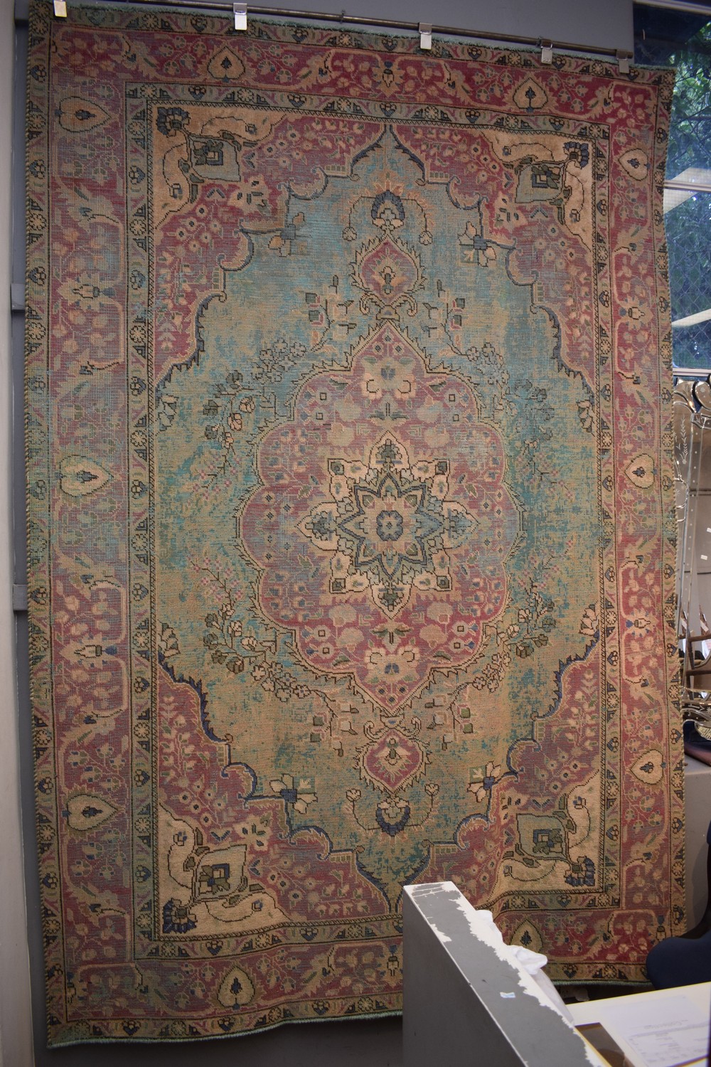 A BEAUTIFUL VINTAGE OVER-DYED PERSIAN TABRIZ RUG, VINTAGE PILE. A UNIQUE MODERN CARPET CREATED FROM AN AUTHENTIC VINTAGE ALL-OVER DESIGN TABRIZ CARPET WITH A CENTRAL ELONGATED MEDALLION AND CORNER MEDALLIONS DEPICTING VASES WITH FLORAL SPRAYS. PLUM BLOSSOM AND FLORAL SPRAYS THROUGHOUT. THE PILE SHORN AND OVER-DYED IN ROSE, TEAL, BEIGE & BLUE TONES. CERTIFICATE OF AUTHENTICITY INCLUDED. SIZE: 283X191CM ORIGIN: PERSIA - RRP: $4,900