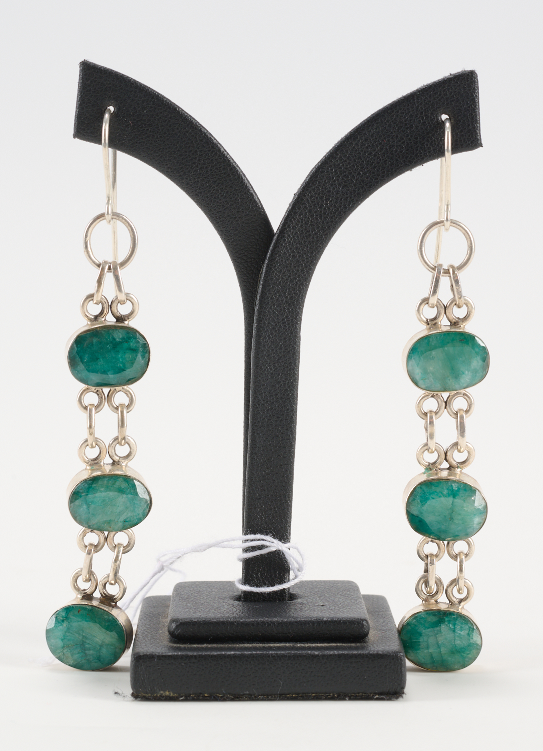 A PAIR OF DYED QUARTZ SET EARRINGS IN INDIAN SILVER, TO SHEPHERDS HOOK FITTINGS, TOTAL LENGTH APPROXIMATELY 69MM