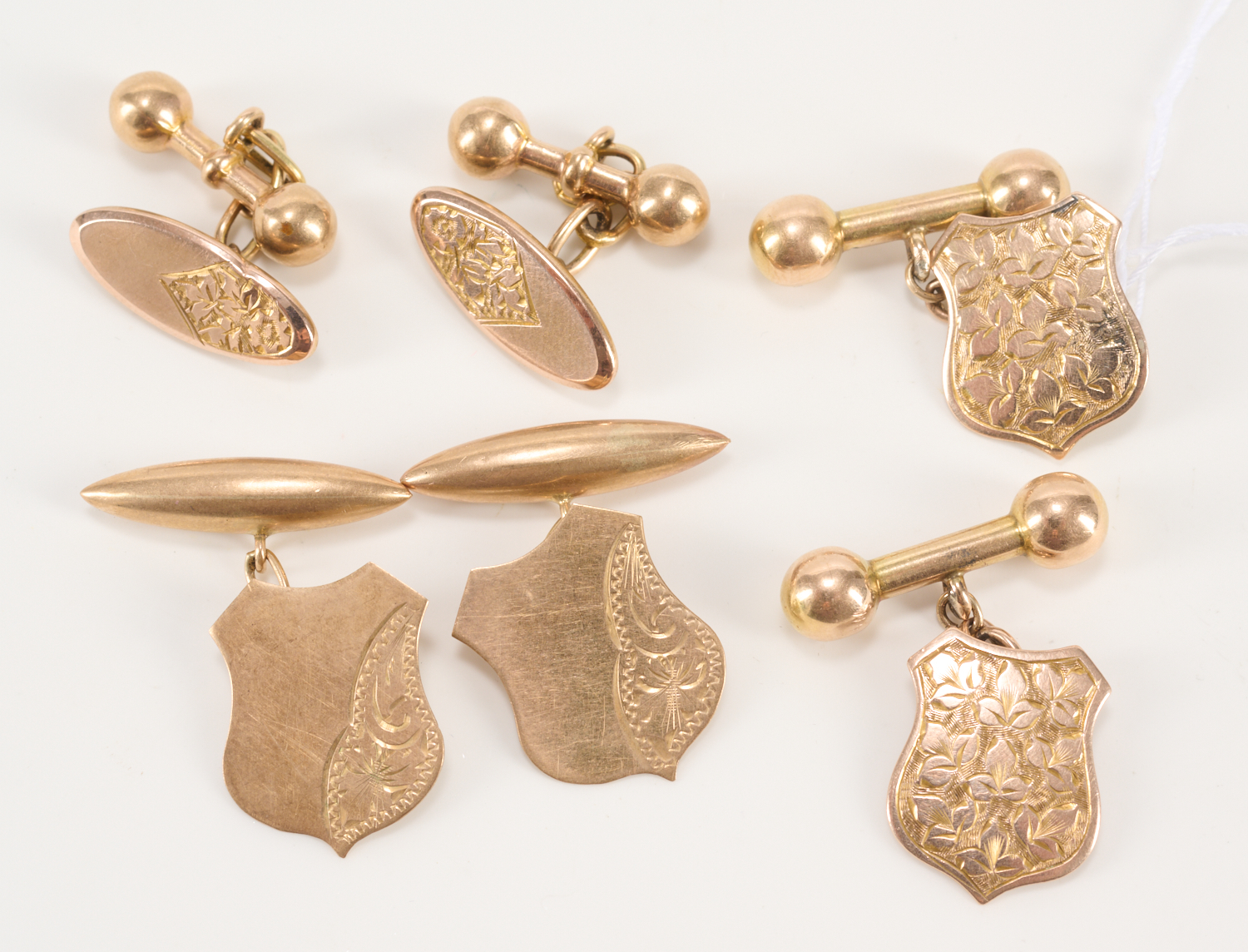 TWO PAIRS OF CUFFLINKS IN 9CT GOLD, 10.82GMS, ONE PAIR IN LOW CARAT GOLD LINED METAL, 3.6GMS
