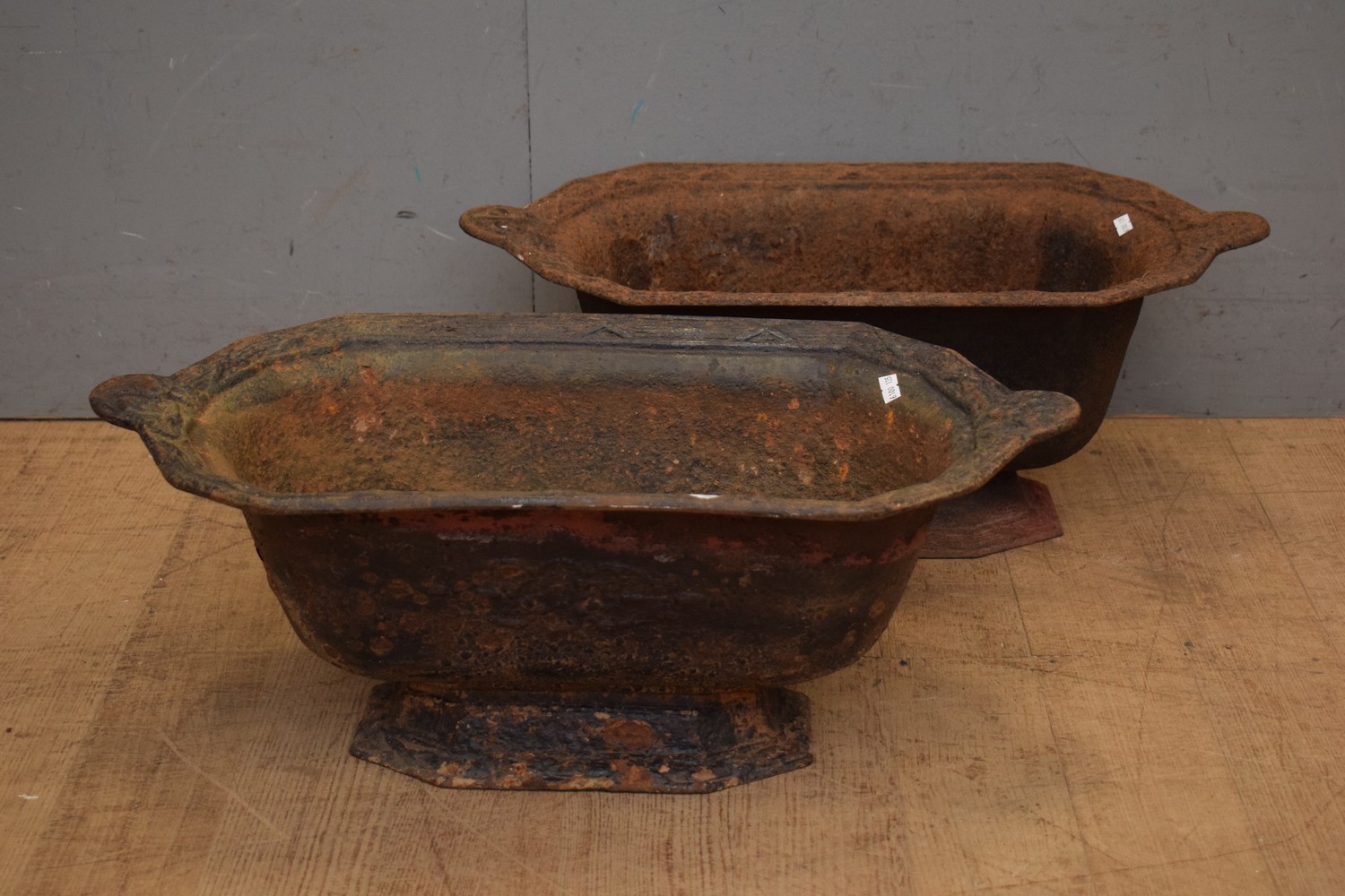A PAIR OF FRENCH CAST-IRON PLANTERS WITH RAISED FLORAL DECORATION TO ONE SIDE (24H x 61W x 32D CM) (LEONARD JOEL DELIVERY SIZE: LARGE)